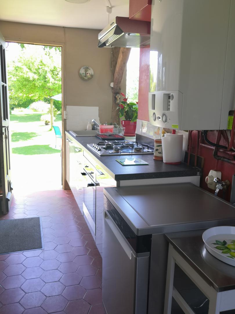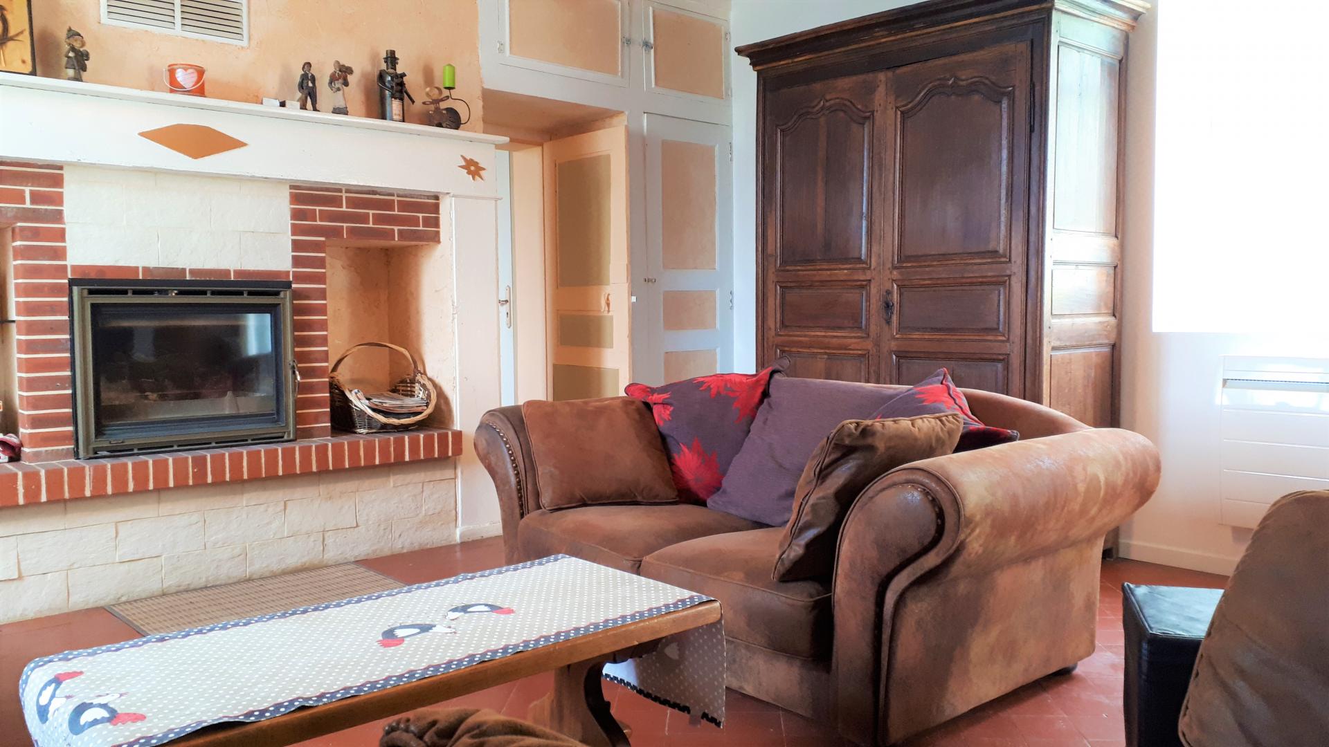 Ce gîte est aménagée en rez-de-chaussée, vous entrez dans la pièce de vie composée d'un salon ouvert sur la cuisine équipée avec coin repas.