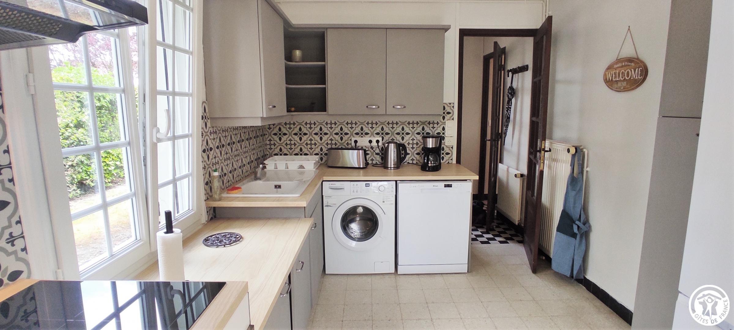 Ce gîte est aménagée en rez-de-chaussée, vous entrez dans la pièce de vie composée d'un salon ouvert sur la cuisine équipée avec coin repas.